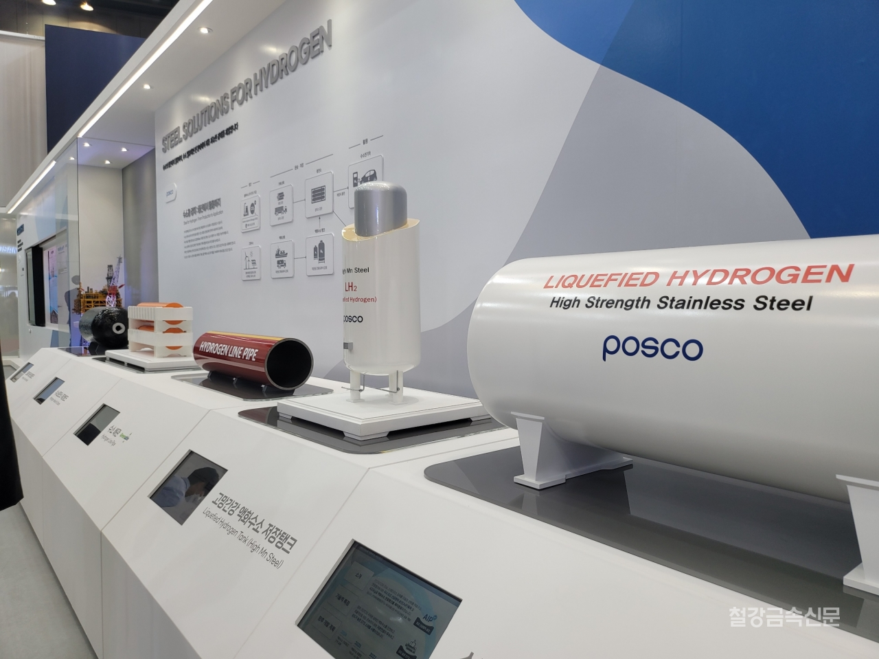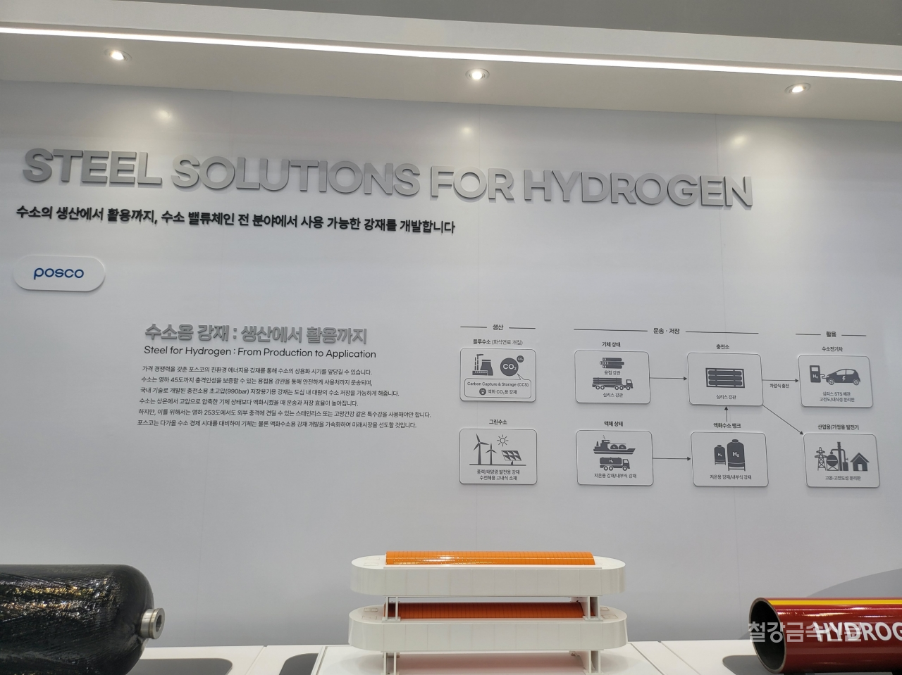 수소를 안전하고 효율적으로 운송하고 저장하기 위한 포스코그룹의 강재 기술 및 제품 솔루션도 선보인다. 포스코 강재를 적용한 수소배관, 수소충전소 저장탱크, 수소차 연료탱크 등의 제품 실물 또는 모형이 전시되어 직접 만져볼 수 있도록 했고, 수소차 연료전지 금속분리판에 사용되는 포스코 스테인리스스틸 Poss470FC와 전기강판, 포스맥(PosMAC) 태양광 패널도 이번 박람회에서 모두 확인할 수 있다.