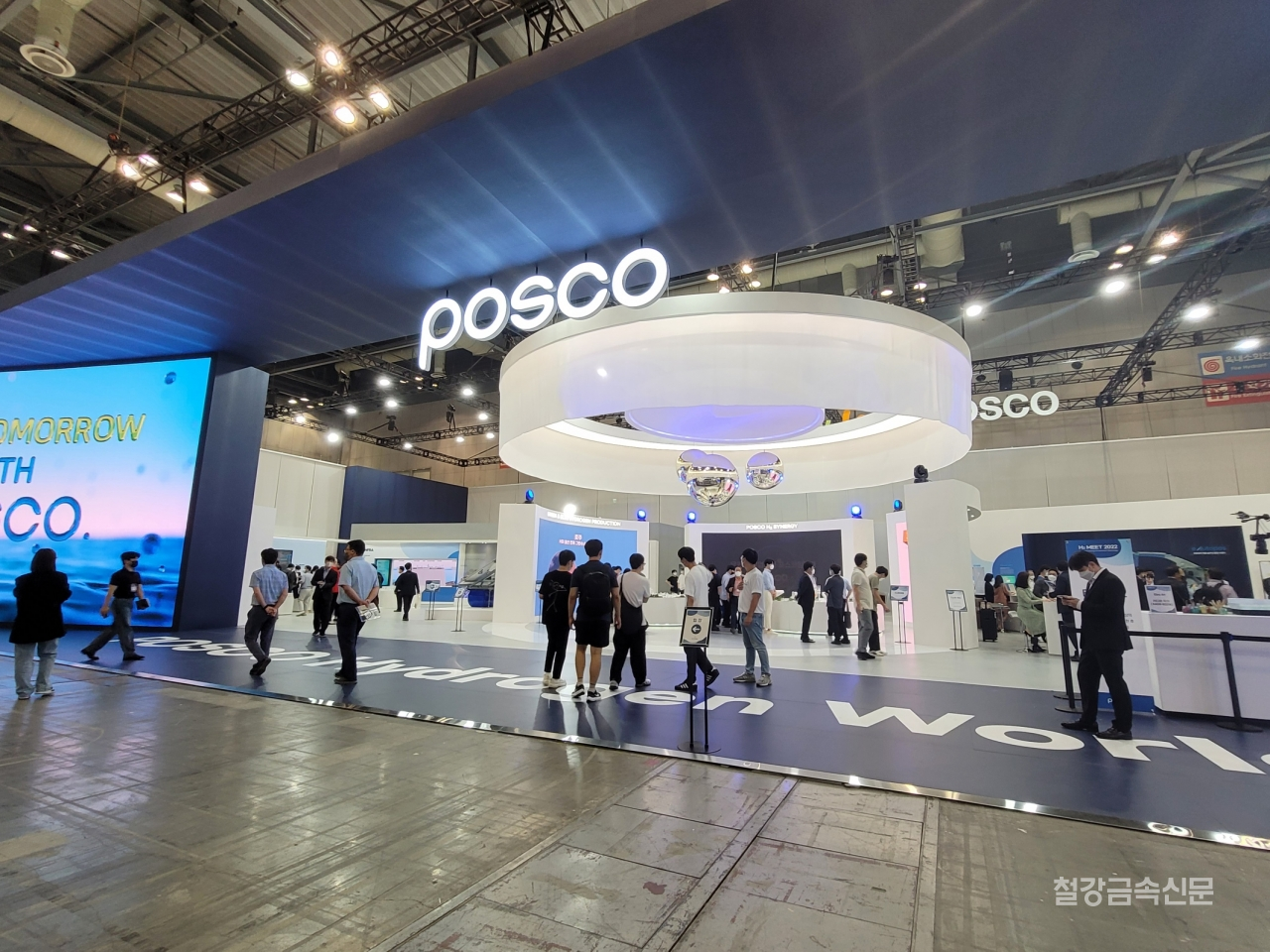 특히 전시 부스 입구에 수소를 테마로 한 압도적 규모의 미디어 아트 영상이 연속하여 흐르고 물방울 형태의 조형물이 설치되어 눈길을 사로 잡는다. 먼저 수소시너지존에서는 수소의 생산부터 운송-저장-활용 각 분야에서 포스코그룹이 추진 중인 사업 청사진과 그룹의 역량을 총망라해 완성하는 밸류체인을 영상으로 소개한다. 포스코그룹은 2050년까지 수소 700만 톤 생산체제를 갖춰 국내 최대 수소 수요처이자 공급자로 발돋움한다는 목표다.