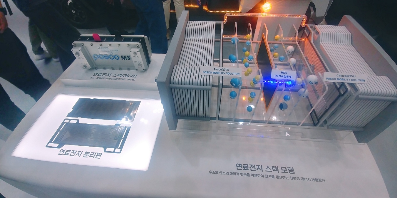 아울러 포스코모빌리티솔루션은 전시회에서 수소연료전지용 분리판도 이전보다 다양한 모델 방식으로 소개했다. 수소연료전지 분리판은 수소연료전지 스택의 핵심 부품 중 하나다. 스택은 수백 개의 단위 셀(cell)을 적층해 조립한 것으로 각 단위 셀은 연료극과 공기극으로 구성된다.