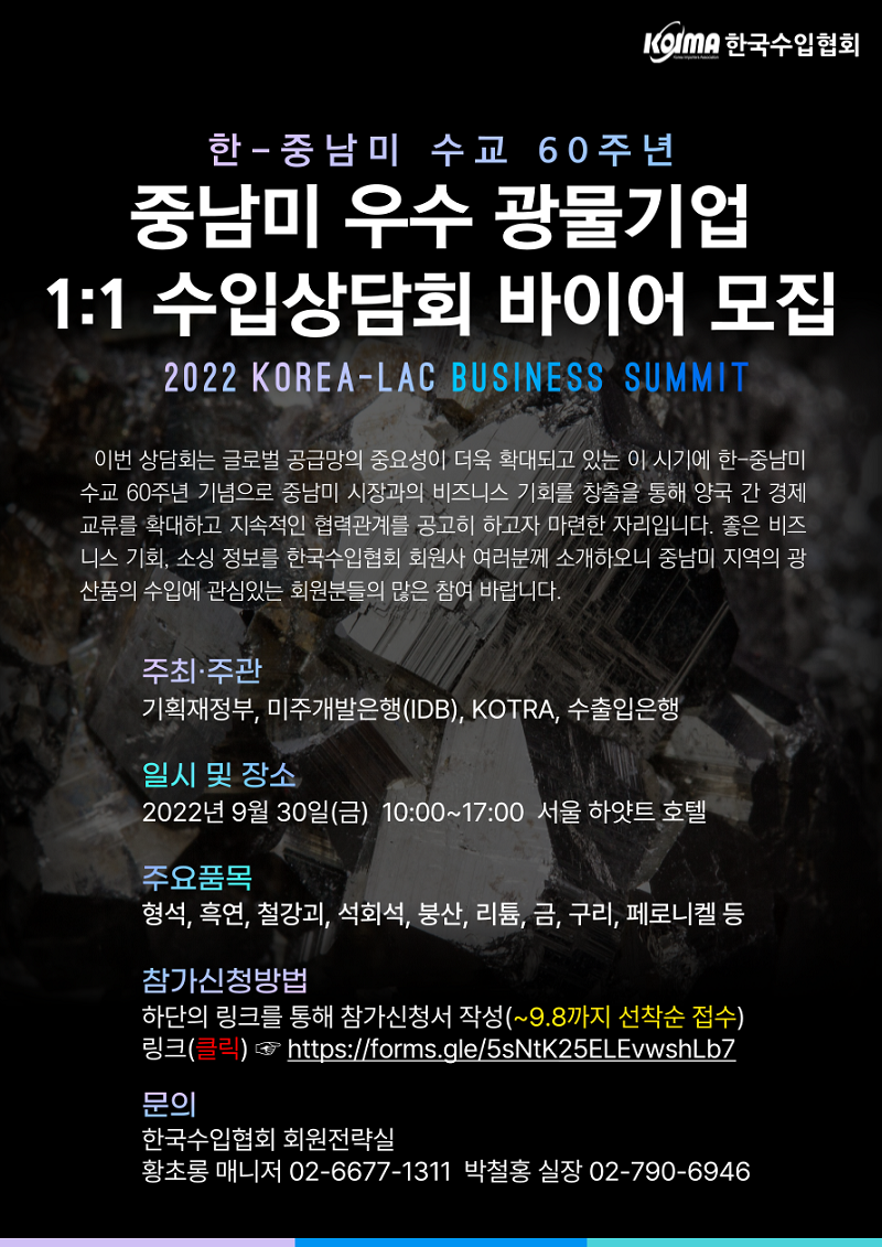 한국수입협회가 9월 30일 「중남미 우수 광물기업 1:1 수입상담회」를 연다.