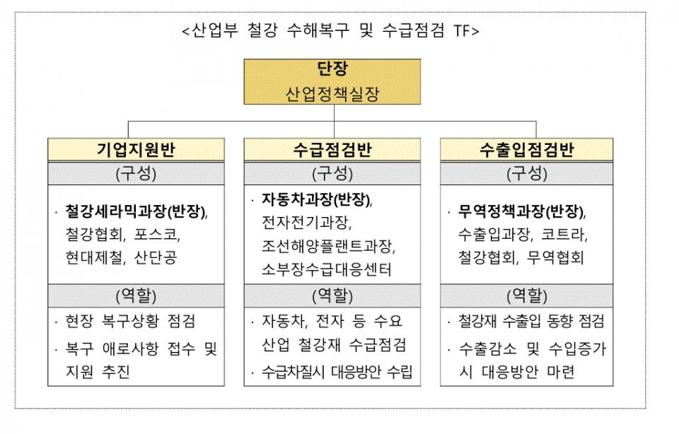 산업부는 TF 가동과 함께 민간 전문가 중심의 민관합동 '철강수급 조사단'도 이번 주 구성해 정확한 피해 상황을 파악하고 현장 복구 지원 및 철강 수급 영향에 대한 전문가 진단을 시행할 예정이다.