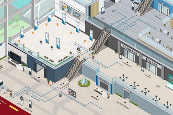 포스코건설 메타스페이스에 접속해 포스코건설 송도사옥으로 들어가면 1층에 여의도 파크원, 광양 LNG 터미널 등 포스코건설의 대표 강건재 프로젝트를 둘러볼 수 있는 ‘강건재 타운’이 있다. 2층에 올라가면 ‘포스코건설 홍보관’과 ‘더샵 라운지’에서 포스코건설과 아파트 브랜드 더샵의 다양한 소식을 접할 수 있다. 3층과 4층에는 회의실, 글로벌아카데미, 컨퍼런스홀 등 회의·사내교육·행사를 위한 공간이 마련돼 있다.