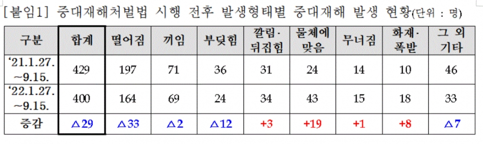 중대재해 사고는 올해 1월 27일부터 9월 15일까지 총 400건 발생해 전년 동기(429건) 대비 7% 감소했다. 중대재해처벌법 시행 8개월이 지난 지금까지도 산업 현장에서 사망사고는 줄지 않고 있는 셈이다.