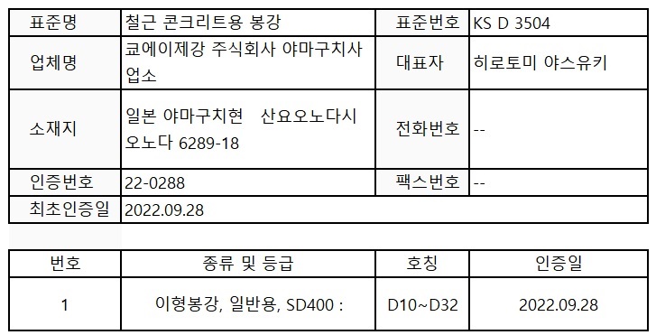 한국표준협회는 9월 28일 자로 공영제강의 철근 KS 인증(SD400 D10~D32) 취득을 홈페이지에 공지했다.
