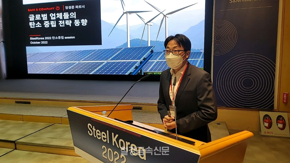 베인앤드컴퍼니 장경준 파트너는 6일 오후 '스틸코리아 2022'에서 탄소중립 주제와 관련해 '글로벌 업체들의 탄소중립 전략 동향'을 발표했다.