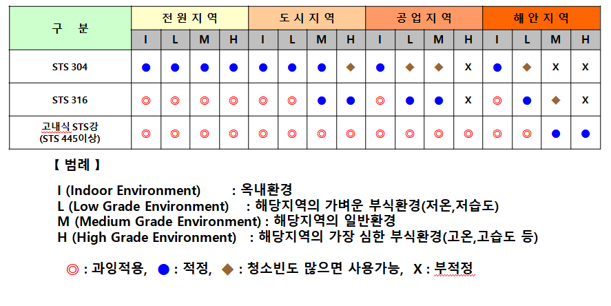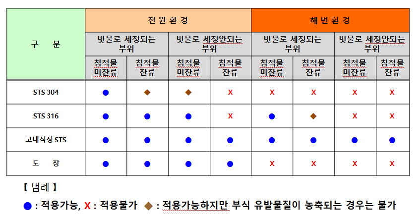 반면 STS316 강종은 일반적인 전원지역과 도시지역에서 소재로 적용한다면 가격을 감안해 과잉 적용으로 판단되지만 공업지역과 해안지역의 일반적 부식환경이라면 304강종보다 적용하는 데 적합하다. 덧붙여 STS445 이상의 고내식강은 대부분의 전원지역, 도시지역, 공업지역에서 적용할 경우, 과잉 적용으로 이해될 수 있지만 해안지역에서의 극한 부식 환경에선 매우 적정한 적용 사례가 될 수 있는 것으로 확인됐다.
