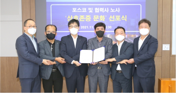 특히 포스코 노동조합이 중심이 되어 포스코와 협력사 직원 간 업무와 일상에서 존중과 배려의 문화가 자리 잡을 수 있도록 자발적인 캠페인도 실시하고 있다. 지난해 11월에는 포스코노동조합과 협력사 상생협의회가 함께 ‘상호존중 문화 정착 공동 선언문’을 채택하고 ‘상호존중 문화 정착’ 활동을 펼치기도 했다.