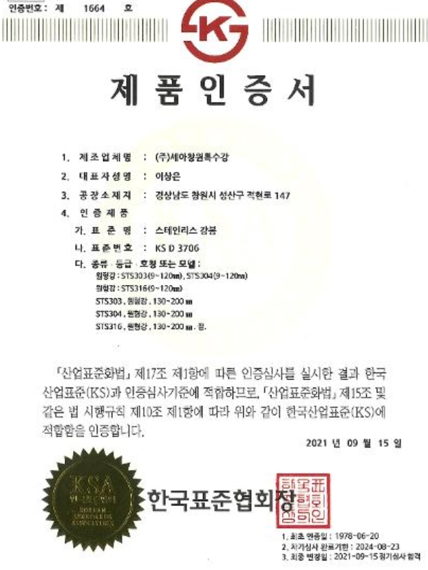 회사는 지난 1978년 국내 최초로 스테인리스 강봉(KS D 3706)을 KS 인증 받은 바가 있다. 세아창원특수강은 현재 총 5개의 KS 인증을 보유하고 있는 가운데 자동차와 기계, 항공, 원자력, 조선 등 수요업계에 최첨단 표준 산업소재를 공급함으로써 국내 산업발전에 기여하고 있다.