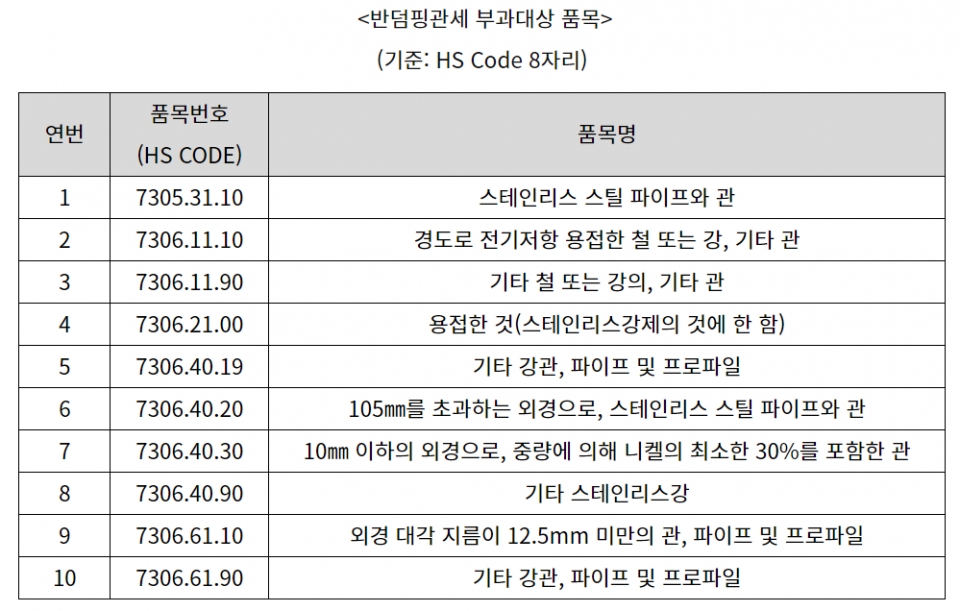 반덤핑 관세 연장 과정에서 제재 내용이 달라진 점도 발견됐다. 2016년 첫 제재 당시에는 HS Code 8자리 코드 기준 9개 품목이 반덤핑 제재를 받았다. 이번 반덤핑 연장 과정에서 이전에 있던 7306.40.10(보일러관)은 제재 목록에서 제외됐으나 7306.40.19와 7306.61.90 등 2건이 새롭게 추가됐다.