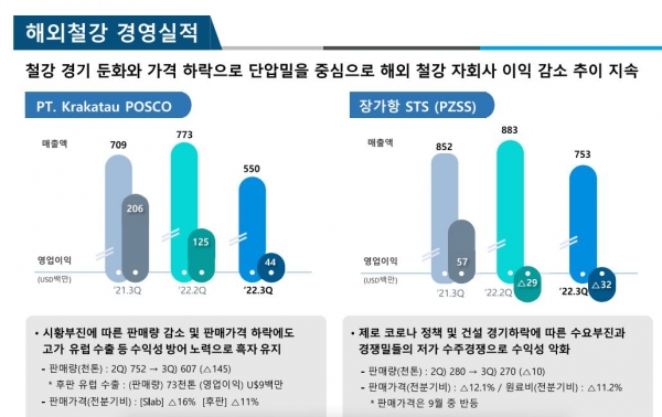 크라카타우포스코는 시황부진에 따른 감소 및 판매가격 하락에도 고가 유럽 수출 등 수익성 방어 노력으로 흑자를 유지했다. 이어 포스코 장가항포항불수강유한공사(PZSS)는 중국의 제로 코로나 정책 및 건설 경기하락에 따른 수요부진과 경쟁밀들의 저가 수주 경쟁으로 수익성 악화로 이어졌다.