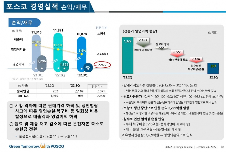 포스코홀딩스에 따르면 시황 악화에 따른 판매가격 하락과 냉천범람 사고에 따른 영업손실·복구비 등 일회성 비용 발생으로 3분기 매출액과 영업이익이 하락했다. 또 원료 및 제품 재고에 따른 운전자본 축소로 순현금이 전환됐다.