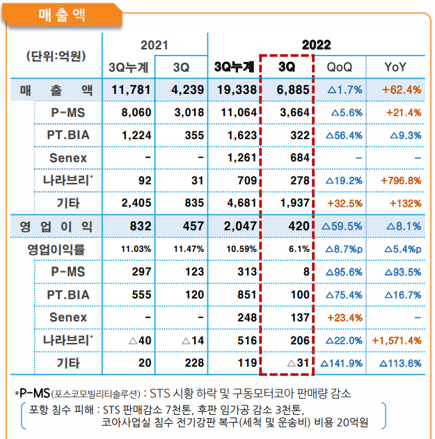 아울러 포스코인터내셔널은 포스코모빌리티솔루션의 구동모터코아 3분기 판매량이 직전 분기보다 약 2만3천톤 감소한 35만대를 기록했다고 밝혔다. 회사 관계자는 “구동모터코아는 유럽향 일부 모델의 수급 조정으로 인해 해외 판매량이 일시 감소했다”라며 “해외 고객사향 구동모터코아 판매량 감소와 STS 시황 하락으로 모빌리티솔루션의 실적이 감소했다”라고 풀이했다.