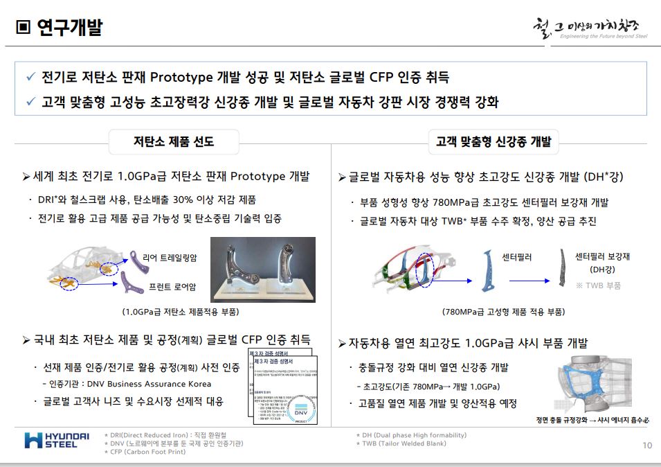 현대제철에 따르면 세계 최초 전기로 1.0Gpa급 저탄소 판재 프로토타입 개발을 완료해 전기로 활용에 대한 고급 제품 공급 가능성과 탄소중립에 대한 기술력을 입증했다. 이와 동시에 국내 최초 저탄소 제품 및 공정 글로벌 CFP 사전 인증을 취득했으며 이를 통해 글로벌 고객사 니즈 및 수요시장에 선제적으로 대응할 방침이다.