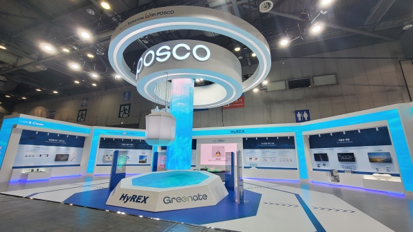 포스코 전시 부스는 EXPO 최대 규모인 324㎡ 규모로 ▲재생에너지와 그린수소 ▲친환경 저탄소 원료 ▲수소환원제철(HyREX) ▲친환경 제품 ▲사회적 온실가스 감축 활동 등 ‘2050 탄소중립’을 향한 포스코의 미래 전략과 기술을 소개하는 5개의 섹션이 구성되어 있다. 특히 전시관 중앙에 다단의 유동환원로를 형상화한 HyREX 오브제를 설치해 고로(용광로)에서 생산되던 쇳물이 수소환원제철로 전환되어 친환경 제품을 생산하는 과정과 지속 가능한 미래를 표현했다.