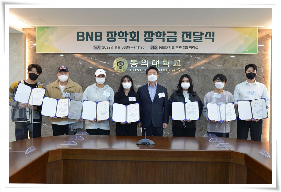 동의대는 지난 3일 BNB장학회와 본관 2층 회의실에서 장학금 전달식을 열고 가야고등학교 출신 동의대 재학생 9명에게 각각 100만원의 장학금을 전달했다고 밝혔다.