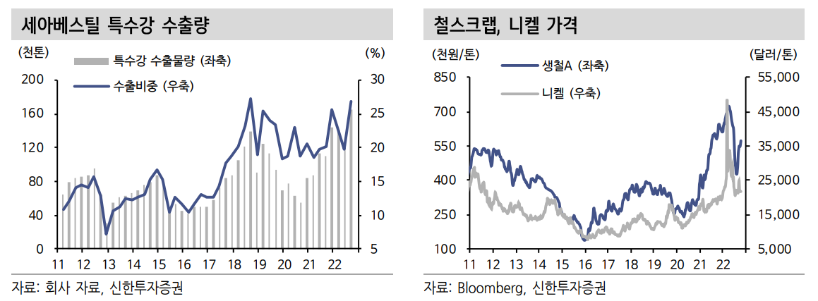 자회사인 세아베스틸의 별도 3분기 영업이익은 212억원으로 직전 분기 대비 73.4% 증가했다. 이에 대해 박광래 연구위원은 시장 기대치인 210억원 수준에 부합했다며 녹록치 않은 수요산업 분위기에도 고부가 제품 수출을 늘려 증익에 성공할 수 있었다고 분석했다. 세아베스틸의 3분기 특수강 수출량은 16만4천톤 수준으로 직전 분기 대비 16.8% 증가했다.