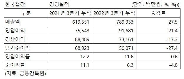 한국철강의 3분기 누적 매출액은 7,899억3,300만원을 기록해 2021년 3분기의 6,195억5,100만원 대비 27.5% 증가했다. 영업이익 역시 916억8,100만원으로 전년 동기 대비 21.4% 증가했다. 그러나 한국철강의 3분기 누적 당기순이익은 500억7,100만원으로 전년 동기의 689억2,300만원 대비 27.4% 감소를 나타냈다.