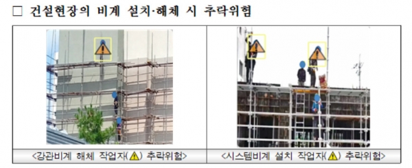 국내 건설현장의 외부 비계는 설치시 하부 작업발판에서 상부 작업발판을 먼저 설치한다. 이후 상부 작업발판으로 이동해 난간이 없는 상태에서 안전난간대를 설치한다. 해체시 안전난간대를 먼저 해체하기 때문에 작업발판 단부로 추락 위험이 높았다.