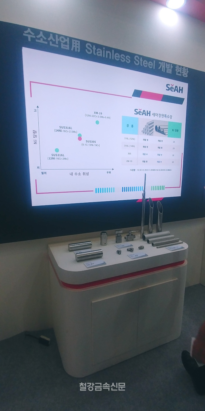 소재 공급사인 세아창원특수강의 경우 수소박람회에서 수소 산업 전방위에서 널리 사용될 수 있는 자사 스테인리스강 일체를 홍보했다. 세아창원특수강은 주요 제품으로 STS305 및 316계 STS봉강과 STS 기반 밸브 및 피팅, 316L STS 무계목강관, 수소자동차용 STS 튜브와 코일튜브 등을 전시했다. 또한 회사는 니켈 당량 25인 316L(12Ni) STS와 니켈 당량 29인 316L(14Ni) 강종의 개발을 완료했다는 사실을 밝히며 니켈 당량 29인 ‘305’ STS, 니켈 당량 32인 ‘XM-19’ STS 강종을 개발 중에 있다는 사실도 공개했다. 이는 수소 산업계에 지속적으로 수소취성에 강한 여러 스테인리스를 공급하고 사용처에 따라 다양한 강종을 선택할 수 있도록 스테인리스 강종 개발을 지속하겠다는 의지를 내비친 것이다.