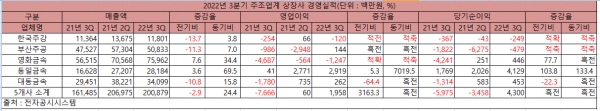 한국주강은 태풍 힌남노로 인한 제철 및 제강 부문의 부진에도 조선과 기계, 광산기계 등의 호조로 수요가 증가하고, 주강품과 압축분철 판매 단가 상승으로 매출액이 증가했다. 다만 전년 동기 대비로는 적자 폭이 감소했지만 철스크랩과 합금철 등 주요 원부자재 가격이 상승세가 지속되고, 물류비용도 상승하면서 영업이익과 당기순이익은 적자가 지속됐다.