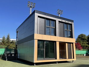 GS건설이 이번에 설치한 스틸 모듈러주택은 2층 규모로, 1모듈 1가구인 ‘스튜디오 타입’과 2모듈 1가구인 ‘베드룸 타입’으로 구성됐다. 특허 기술 적용 외에도 투명전도막을 유리표면에 코팅해 에너지를 절감하는 발열유리를 설치했고, 내부에 노출되는 모듈러 접합부에는 마그네틱 조명을 적용했다.