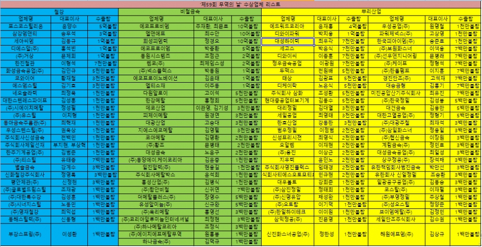 수출 유공자 부문에서는 금탑산업훈장에 희성피엠텍(주) 정경오 대표이사와 디케이락 주식회사 노은식 대표이사, (주)대성하이텍 최우각 회장 등 3명, 은탑산업훈장에 포스코인터내셔널 박혁상 상무, 동탑산업훈장에 에드워드코리아 정용호 상무와 포스코 김경한 전무 등 2명, 산업포장에 현대제철 김성민 상무와 희성촉매 송진우 팀장, 디와이파워(주) 정해영 이사와 (주)풍산 김영주 부사장이 수상의 영예를 안았다.