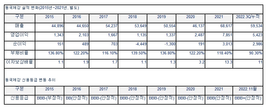사업구조 재편은 경영 성과와 재무 구조 개선으로 이어졌다. 별도 기준 2022년 3분기 말 동국제강 부채비율은 90.3%로 두자릿 수대에 진입했다. 이는 2015년 136.7%에서 46.4%p 개선된 수치다. 이자보상배율(영업이익/금융비용)은 2015년 1.1배 수준에서 2022년 3분기 말 현재 11.0배로 우량 회사로 탈바꿈했다.