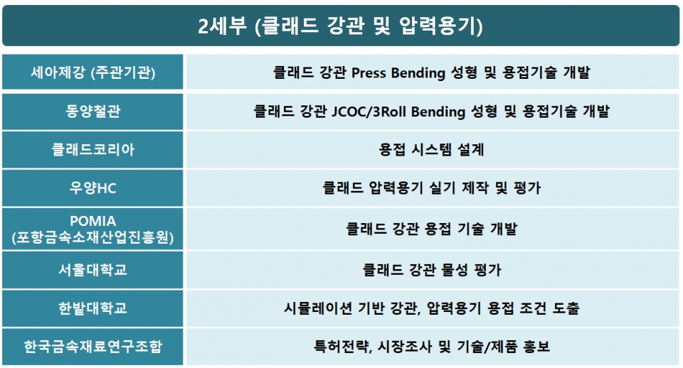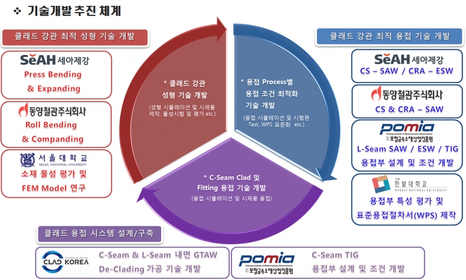 이 같은 시장 가능성을 확인한 세아제강은 이번 정부 소재 연구 사업에서 클래드 판재를 이용한 강관 및 압력용기 제조 기술 개발을 맡고 있는 2세부의 주관 기관으로 참여했다. 회사는 공동 개발 첫해인 2020년부터 같은 2세부 소속 기관인 한국금속재료연구조합, 동양철관, 클래드코리아, 우양HC, 포항금속소재진흥원, 서울대, 한밭대 등과 함께 클래드 후판을 사용한 강관 제품의 제조 기술을 개발하고 안정적인 제조 기반을 구축하려 노력했다.