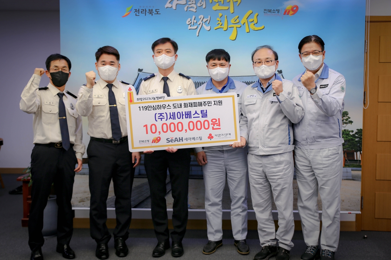 기부금은 전북사회복지공동모금회를 통해 주택화재 피해를 본 도내 취약계층의 집을 수리하거나 이동식 주택을 설치해 주는 119안심하우스 지원사업에 사용될 예정이다. 세아베스틸은 지난해 1월에도 화재피해주민을 위한 119안심하우스 사업에 1천만원을 기탁한 바 있다.