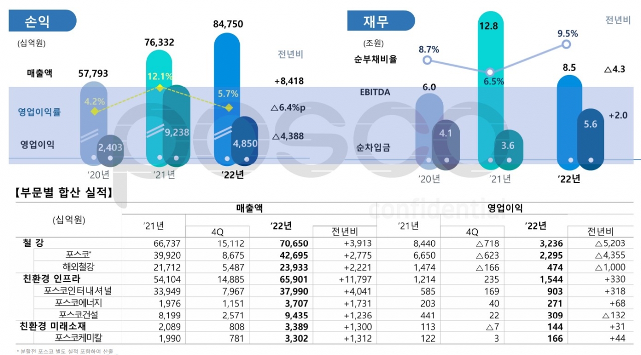 포스코홀딩스는 27일 오후에 컨퍼런스콜을 통한 기업설명회를 개최하며 2022년도 연결기준으로 매출 84.8조원, 영업이익 4.9조원, 당기순이익 3.6조원의 실적을 기록했다고 밝혔다. 이는 전년대비 연결 기준 매출액은 11.1% 증가, 영업이익과 당기순이익은 각각 46.7%, 50% 감소한 수치다.