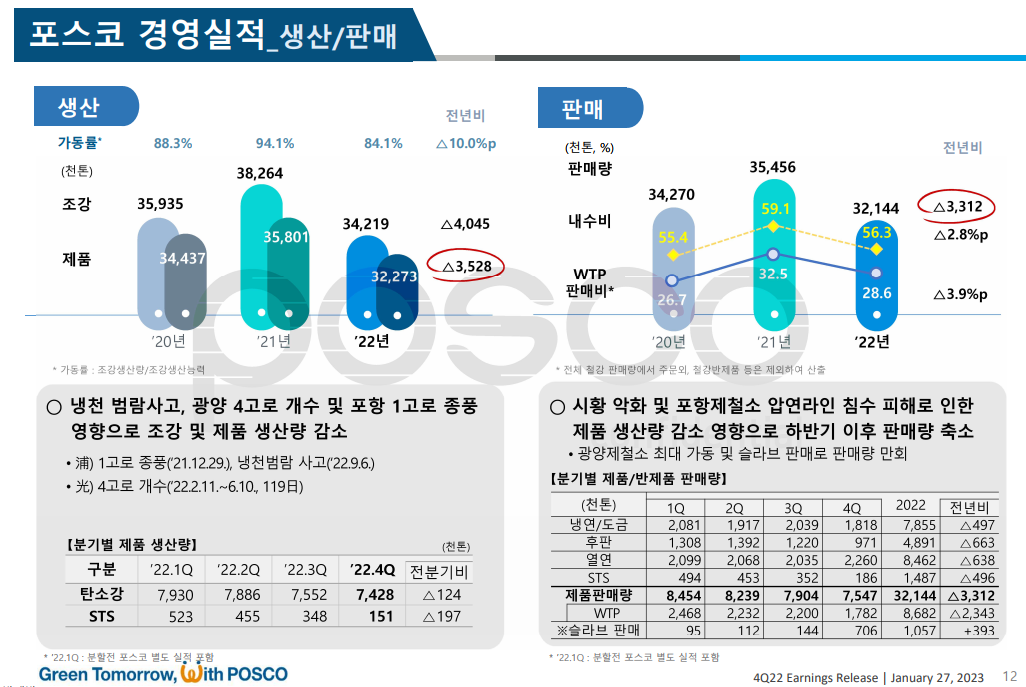 포스코는 2022년 판매량 3214만4000톤을 기록해 전년대비 331만2000톤 감소했다. 이는 전년 대비 9.3% 줄어든 수치로 시황 악화 및 포항제철소 압연라인 침수 피해로 인한 하반기 이후 판매량 축소에 따른 것이다.