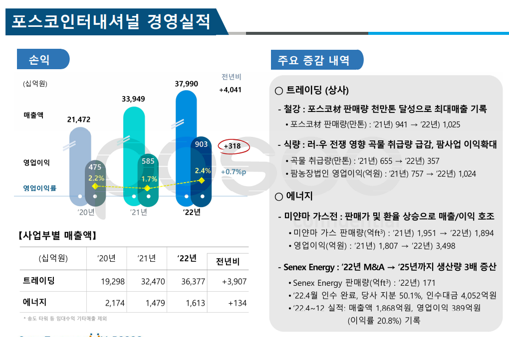 주요 증감 내역으로는 트레이딩(상사)부문에서 포스코재 판매량이 2021년 941만톤에서 2022년 1025만톤으로 늘며 최대 매출을 기록했고, 식량 부문에서는 러우 전쟁 영향으로 곡물 취급량이 급감함에 따라 팜사업 이익이 확대됐다.