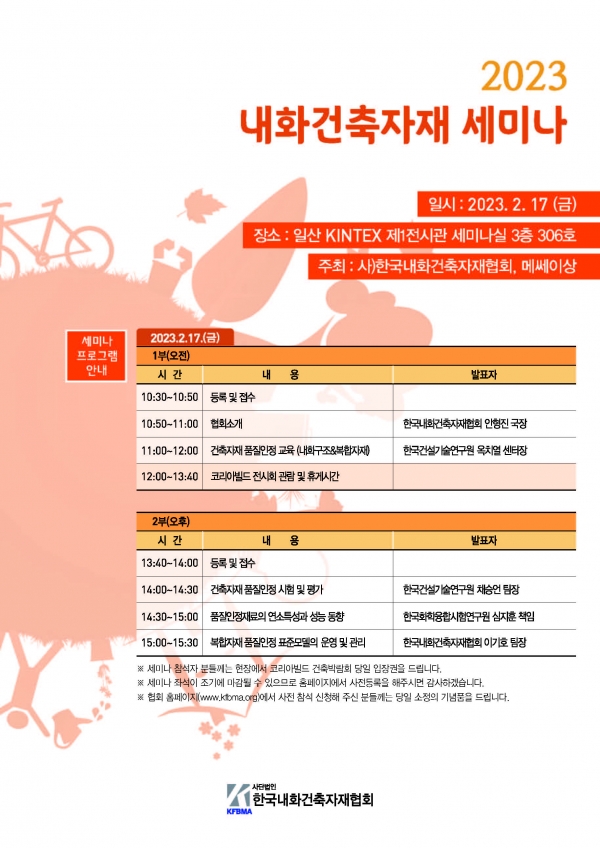 한국내화건축자재협회(대표 김영화)가 오는 2월 17일 경기도 일산 킨텍스에서 '2023년 내화건축자재 세미나'를 개최한다.