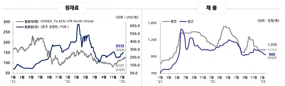 중국의 코로나19 정책 완화 이후 수요 확대 기대감으로 철광석 등 원재료 가격이 상승세를 보이고 있으나 국내 철강 제품 가격 회복은 경기 부진으로 다소 제한적일 것이란 분석이 나왔다.