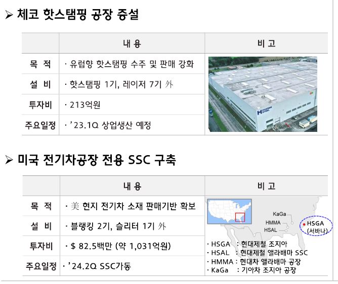 설비투자 측면에서 현대제철은 체코 핫스탬핑 공장 증설을 통해 유럽향 핫스탬핑 수주 및 판매 강화에 나선다. 총 213억원을 투자해 핫스탬핑 1기와 레이저 7기 등의 설비를 마련, 올해 1분기부터 상업생산에 들어갈 예정이다.
