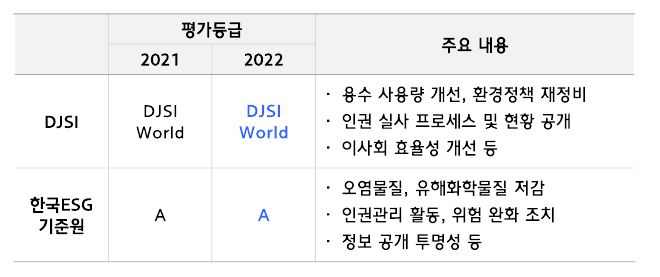 ESG 측면에서는 지속 가능경영 평가가 글로벌 기업 상위 10%에 해당하는 DJSI(Dow Jones Sustainability Indices) 월드 지수 5년 연속 편입과 한국ESG기준원에서 'A등급'을 획득하는 등 ESG 전 부문에 걸쳐 우수 등급을 유지하고 있다.