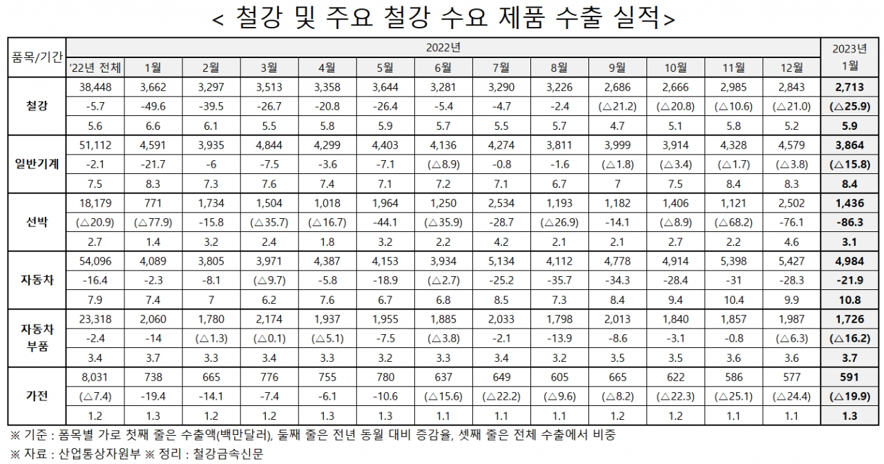 한편, 같은 날 산업통상자원부는 15대 품목의 1월 수출 성과를 밝히며 1월 철강 수출액이 27억1천만달러로 전년 동월 대비 25.9% 급감했다고 밝혔다. 산업부는 “글로벌 수요둔화로 판재류를 포함한 주요 철강 가격이 하락하면서 미국·EU·일본·중남미 등 대다수 주요시장에 대한 수출이 감소했다”라고 설명했다.