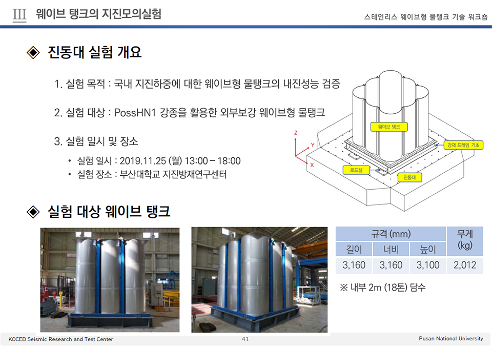 구체적 수치로도 스테인리스 웨이브형 물탱크의 내진 우수성이 확인된 사례도 있다. 지난 2019년 한국강구조학회는 부산대 지진방재 연구센터에서 스테인리스 웨이브형 물탱크(PossHN1강 적용 패널 3m 정육면체 패널 적용)에 대한 내진 성능을 검증한 바 있다. 검증 결과, 웨이브형 물탱크는 설계 지진력(진도 약 6.5 수준)보다 2.5배 큰 지진에서도 주요한 구조적 손상 없이 충분한 내진 성능을 확보하는 것으로 나타났다.