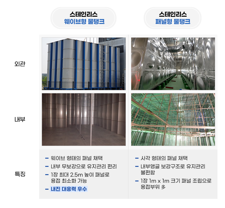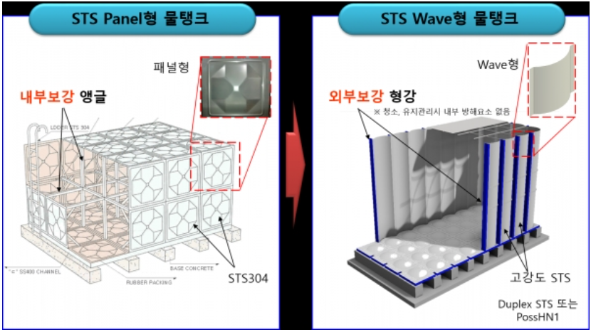 스테인리스 웨이브형 물탱크는 벽체가 사각 형태의 패널이 아닌, 물결 모양의 스테인리스 패널로 구성되어 있다. 이 패널에는 스테인리스강 중에서도 우수한 내식성과 항복강도를 가진 고강도강(PossHN1, STS316HN3, STS329LD)이 적용된다. 패널 한 장당 높이가 최대 2.5m이기 때문에 1m 높이의 패널형 물탱크보다 용접을 최소화하여 제작할 수 있다.