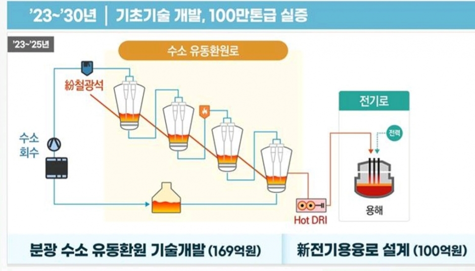 수소유동환원은 철광석 환원 시 석탄(C) 대신 수소(H)를 활용해 이산화탄소 대신 수증기를 배출하는 기술로, 철강산업 탄소 배출을 획기적으로 감축하는 신기술이다. 이는 「탄소중립 산업핵심기술 R&D」 내 전략과제로 2023년에서 2025년까지 269억원이 배정됐다.