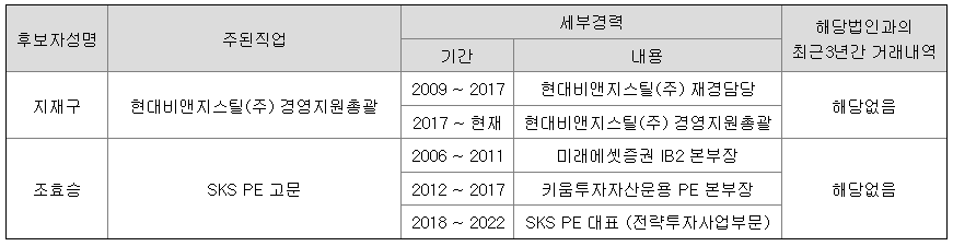 사외이사와 감사위원에는 사외이사후보추천위원회의 추천으로 SKS PE 조효성 고문이 포함됐다. 이에 대해 회사는 “3년간 당사 사외이사로 재직하며 높은 이사회 출석률로 이사회 경영 회계/재무전문가로서 감사위원회의 제도적인 필수 구성원 요건 충족했다”라며 “수년간 다양한 기업 컨설팅 경험을 바탕으로 당사 신성장동력 발굴 및 경영 목표 달성에 기여할 것”이라고 설명했다.