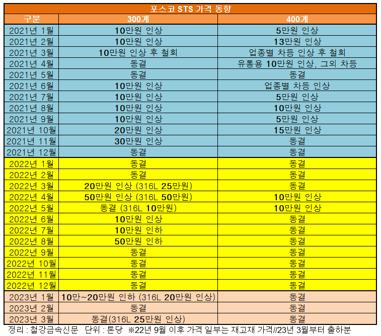 이에 포스코는 원료 시장과 국내 STS 시황, 수요 산업 업황 등을 감안하여 300계와 400계 가격을 유지하기로 결정했다. 또한 최근 글로벌 STS 제조업계가 원료 가격 동향을 감안해 300계 및 400계 가격 인상을 자제하는 방향을 보이고 있는 점도 감안된 것으로 보인다.