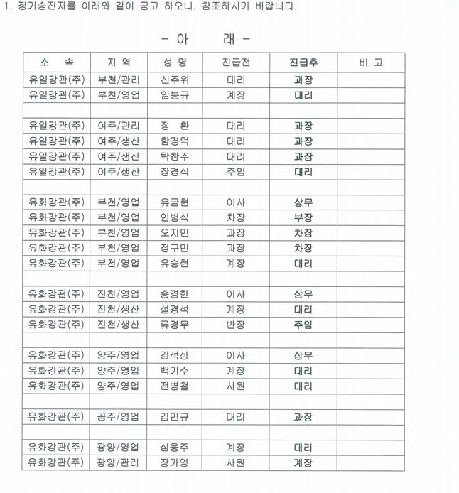 강관 제조업체 유일강관, 유화강관이 2023년 정기 인사를 단행했다. 이하 내용은 다음과 같다. ■ 2023년 정기 진급자 명단 박재철 기자 parkjc@snmnews.com 다른 기사 보기 관련기사 강관업계, 제품 개발로 근로자 ‘근골격계’ 부담 줄이는데 앞장 SAW강관업계, 신수요 창출로 불황극복 배관용강관 업계, 제품 생산 차질에 3월 가격 인상 탄력 (강관) 구조관 업계, 3월 제품價 인상 나서 배관용강관 업계, 3월 제품價 인상 나서 "태광, 중동 석유화학플랜트 프로젝트 발주 증가 기대" 저작권자 © 철강금속신문 무단전재 및 재배포 금지