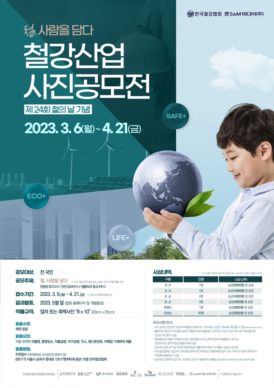 '철, 사람을 담다' 주제는 세부적으로는 친환경(ECO+), 안전 (SAFE+), 생활 속의 철 (LIFE+) 등으로 표현할 수 있다. 작품 규격은 컬러 또는 흑백사진 8“x10” (20cm x 25cm)이며, 출품 수량에 제한은 없다. 작품은 우편을 통해 접수할 수 있다. 작품 뒷면에 작품명, 촬영 장소, 작품 설명, 작가 성명, 주소, 핸드폰 번호, 이메일을 기재하여 제출하면 된다.