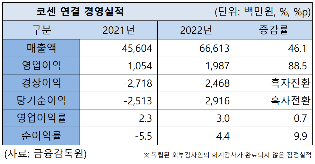 지난해 경영 실적 내용에 대해 코센 관계자는 “안정적인 원재료 수급과 판매단가 상승으로 인한 매출액 증대 및 영업이익 개선을 이뤘다”라며 “경영진 교체 이후 체질 개선도 한몫을 했다”라고 설명했다.