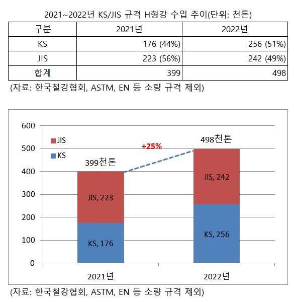 2021~2022년 SS400 H형강 수입량은 총 89만6천톤이다. 이 중 비KS 규격인 JIS 제품이 42만천1톤으로 전체 수입량의 47% 비중을 차지했다. 또한, 이들 제품은 대부분 일본과 중국에서 수입되고 있다.