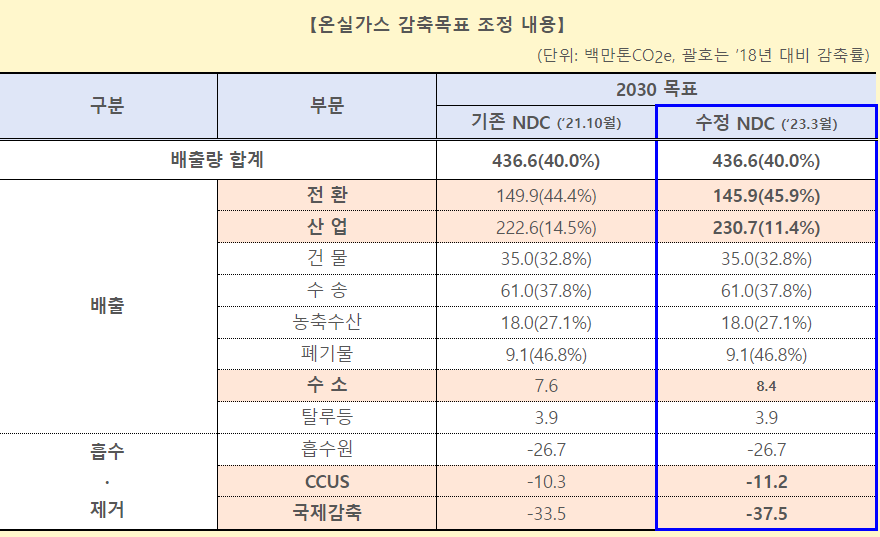 정부는 "원료수급, 기술전망 등 현실적인 국내 여건을 고려해 산업부문 감축 목표를 완화했다"며 이산화탄소 포집·저장·활용(CCUS) 부문은 국내 탄소저장소 확대를 통해 온실가스 흡수량을 증가시킬 수 있는 점을 반영했다"고 밝혔다. 또한 "수소 부문은 블루 수소 증가로 배출량이 일부 증가(760만t CO2e → 840만t CO2e)할 것으로 예상된다"고 밝혔다.