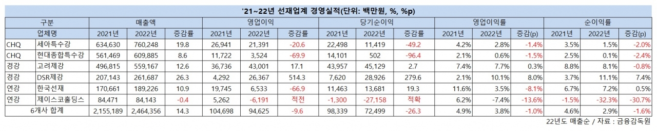 지난해 선재업계의 수익성이 대부분 악화된 것으로 나타났다. 코로나19 기저효과 소멸과 각종 비용 상승에 따른 경제적 불확실성 증대로 매출은 늘었으나 영업이익이 크게 감소했다. 다만, 경강선재 업계만이 유일하게 수익성을 거머쥐며 두드러진 실적 확장세를 이어갔다.