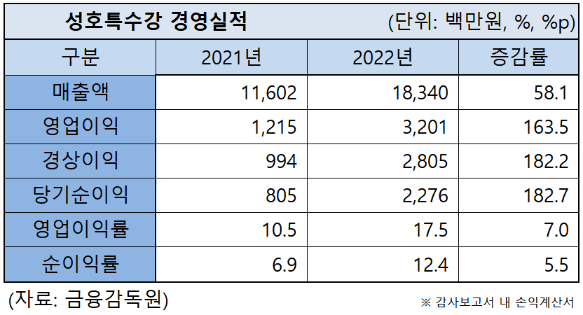 성호특수강은 지난해 경영실적으로 매출액 183억4,000만원을 달성했다. 전년 대비 약 67억원, 58.1% 급증했다. 제품매출이 전년 대비 약 14억원 증가한 76억3,100만원을, 상품매출이 전년 대비 약 54억원 증가한 105억6,300만원을 기록했다. 기타매출은 전년보다 약 5천만원 감소한 1억4,600만원 수준이다.