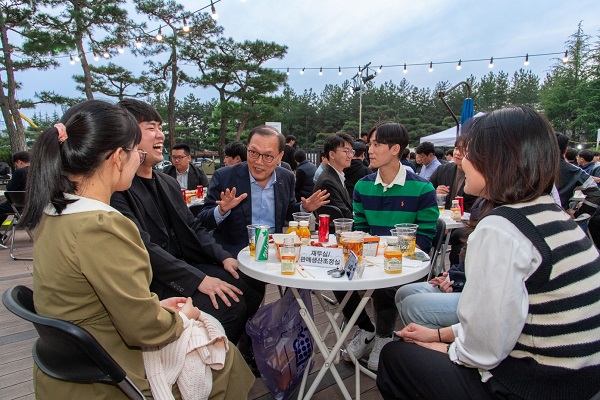 이진수 전남 광양제철소장이 지난달 30일 광양시 금호동 백운아트홀 야외테라스에서 ‘MZ 소통콘서트’를 열며 젊은 현장 직원과의 소통에 나섰다.